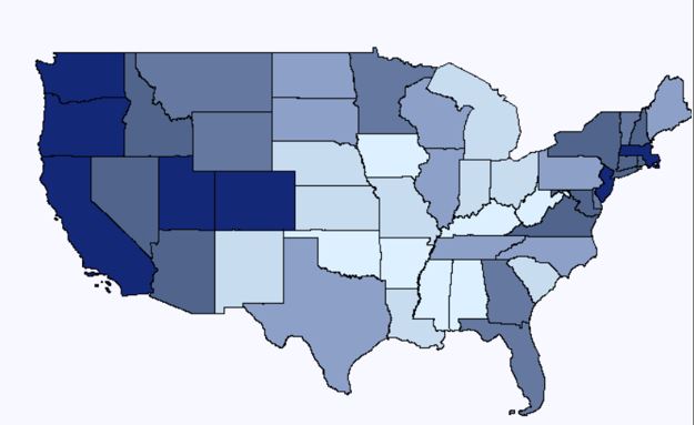 (as opposed to the 46 in the lower three buckets). The only two states in the top bracket are California and Hawaii. And now we can see that the states